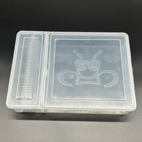 Transparent bee feeder featuring a flat, rectangular base with raised edges and a central reservoir for liquid food