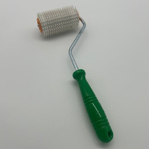 This cylindrical tool roller with small spikes is designed to simplify honey extraction by gently puncturing the wax caps on honeycomb cells which helps to preserve the comb structure for the future use of the bees.