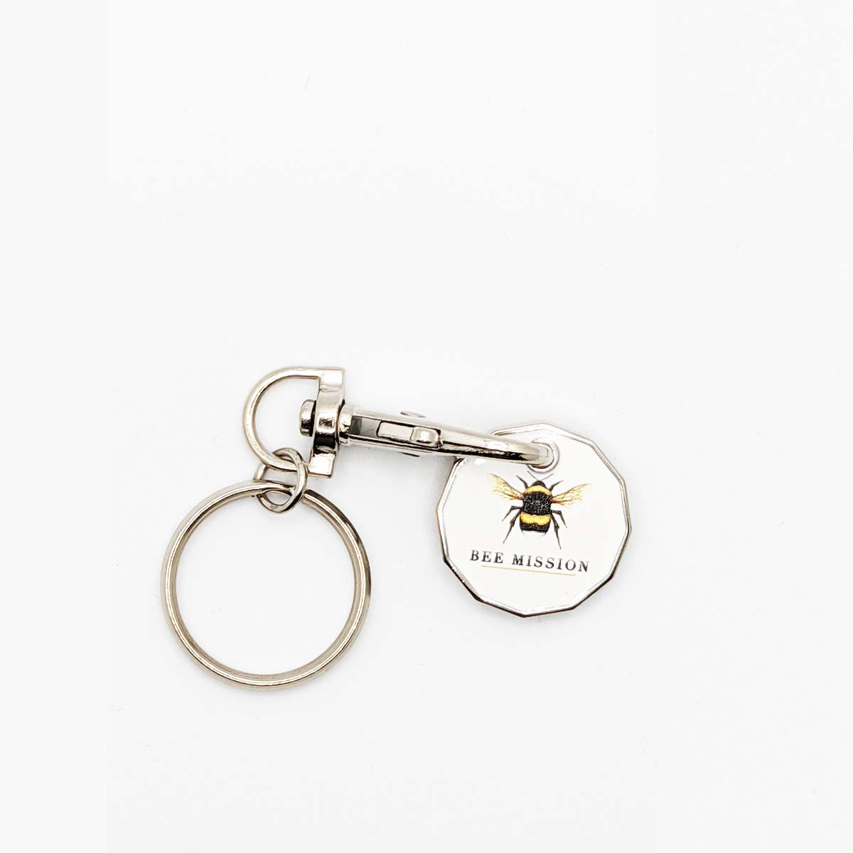 A Reusable Trolley Token featuring the Bee Mission bee design. Comes with a keyring for convenience. A useful item that also supports our campaign to protect pollinators.