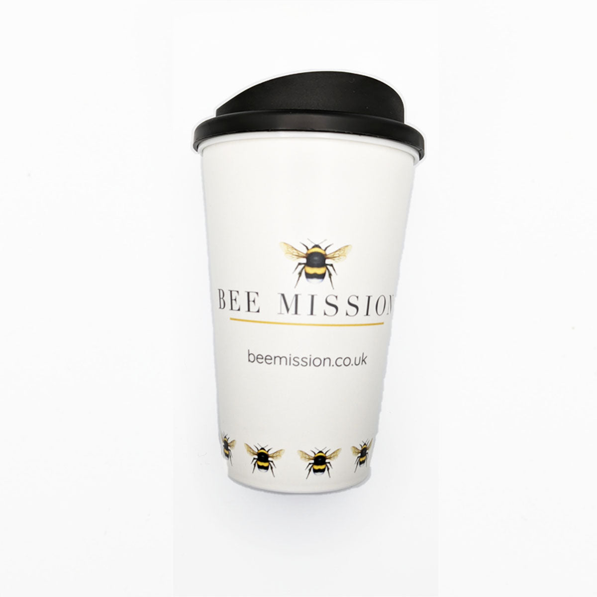 A Reusable Travel Mug with secure lid and Bee Mission branding. Keeps drinks hot or cold. Reduces waste and supports our aim to help bees and the environment.